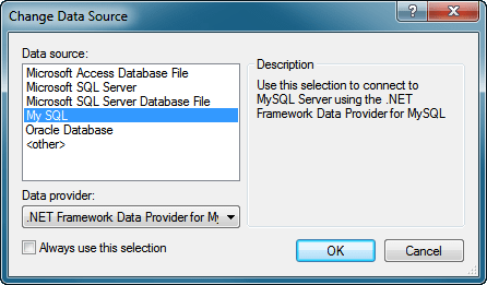 In order to connect to MySQL, you must first download the ADO.NET driver for MySQL called Connector/Net. This can be found at the MySQL web site: http://dev.mysql.com/downloads/connector/net/